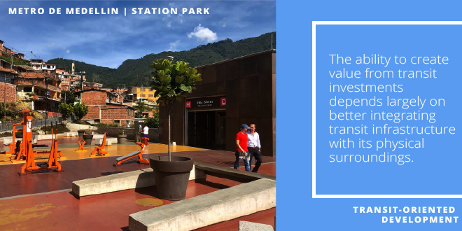 Trying to integrate surrounding land uses with transit infrastructure, once the infrastructure is already built, can be a challenging if not an impossible task. Metro’s approach to transit planning includes proactive strategies to acquire land, particularly around stations, that have the scale and capacity to be developed later. As transit stations are the primary interface between the transit system and the rest of the Metropolitan Area, this approach ensures station areas can support transit-oriented development, as well as safe and easy access to stations. The end goal is to have active station areas and higher ridership. Planning around Medellin’s Metro system also involved developing land in areas with little or non-existent public investment, with a focus on improving public infrastructure and amenities such as parks, libraries and streets.