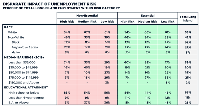 While the unfairness of the virus’s effects—both physical and economic—are well-known, that a disproportionate share of jobs at high risk for unemployment are occupied by workers without a post-secondary education, while jobs with the lowest risk of unemployment are disproportionately occupied by workers with a bachelor’s degree or above, suggests that those at highest risk are also those most limited in their ability to find alternative job opportunities given their existing skill set. This suggests that retraining or reskilling initiatives need to be central to future recovery efforts on Long Island.