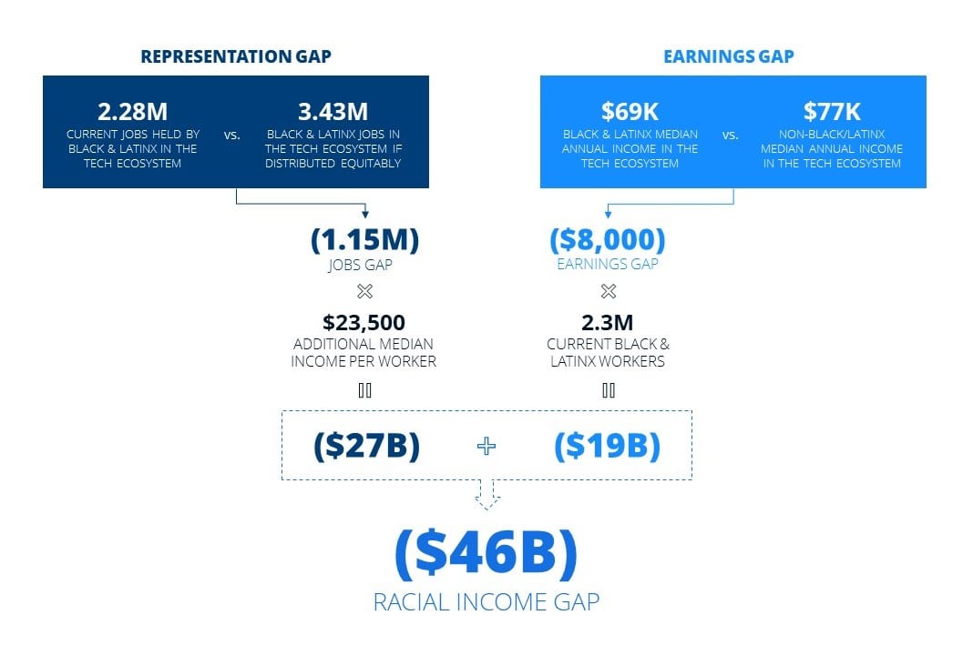 - Equip tech equity champions with data that demonstrates the size of tech’s racial income gap and the costs of inaction. The analysis below is a start.