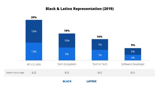 - A representation gap: 1.1 million fewer Black and Latinx Americans work in tech than if the tech workforce mirrored the U.S. workforce. Since tech jobs pay more on average than jobs with similar educational requirements in other sectors of the economy, shifting to a tech job would, on average, boost Black and Latinx workers’ earnings by $23,500 per year, or $27 billion in aggregate.