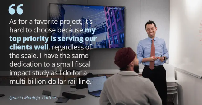 As for a favorite project, it’s hard to choose because my top priority is serving our clients well, regardless of the scale. I have the same dedication to a small fiscal impact study as I do for a multi-billion-dollar rail line. There is always a special satisfaction in seeing the physical result. Right now, I’m helping the MTA plan the Interborough Express. It’s a transformative project connecting Brooklyn and Queens, reusing existing infrastructure to change millions of lives. It involves nearly every discipline we have at the firm, and it’s exactly the kind of puzzle I love solving. Ask me this question again in five years—hopefully, I can answer it by showing you a picture of me riding the train.