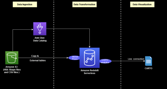 Figure 1: Workflow illustrating data ingesting, transformation, and visualization using Redshift and CARTO.