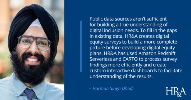 Public data sources aren’t sufficient for building a true understanding of digital inclusion needs. To fill in the gaps in existing data, HR&A creates digital equity surveys to build a more complete picture before developing digital equity plans. HR&A has used Amazon Redshift Serverless and CARTO to process survey findings more efficiently and create custom interactive dashboards to facilitate understanding of the results. HR&A’s collaboration with Amazon Redshift and CARTO has resulted in a 75% reduction in overall deployment and dashboard management time and helped the team achieve the following technical goals: