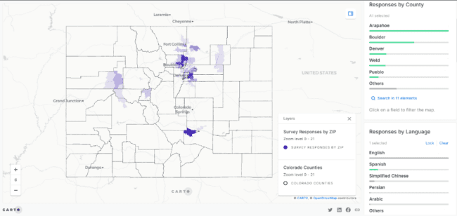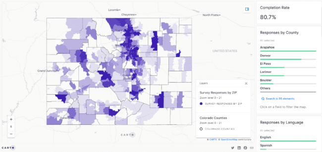“Working with the team at HR&A Advisors, Colorado’s Digital Equity Team created a custom dashboard that allowed us to very effectively evaluate our reach while surveying historically marginalized populations across Colorado. This dynamic tool, powered by AWS and CARTO, provided robust visualizations of which regions and populations were interacting with our survey, enabling us to zoom in quickly and address gaps in coverage. Ensuring we were able to seek out data from those who are most impacted by the digital divide in Colorado has been vital to addressing digital inequities in our state.”