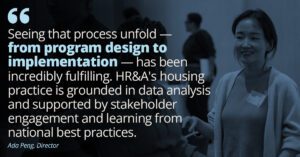 Peter: Another area where we’re innovating is in building the capacity of public agencies to take a more active role in addressing affordable housing needs. We’re working with one housing authority in a major city to evaluate how they can increase the number of projects they own and manage. This aligns with our work across the country, where public agencies are seeking to have a larger role in housing development. Innovative housing projects require a mix of public policy expertise, understanding of deal economics, and risk management, which is where the diverse knowledge of HR&A’s housing practice is a real differentiator.